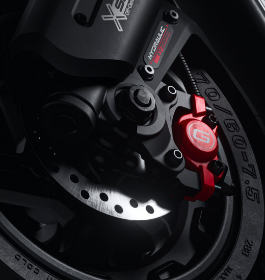 Păstrați controlul la viteze mari și încetiniți cu un sistem de frânare eficient. Frânele cu disc cu piston cu acțiune dublă îmbunătățite au patru plăcuțe de frână, două pentru fiecare etrier de frână. Acest lucru asigură un contact mai bun între plăcuțe și rotor, îmbunătățind disiparea căldurii și sporind eficiența frânării.